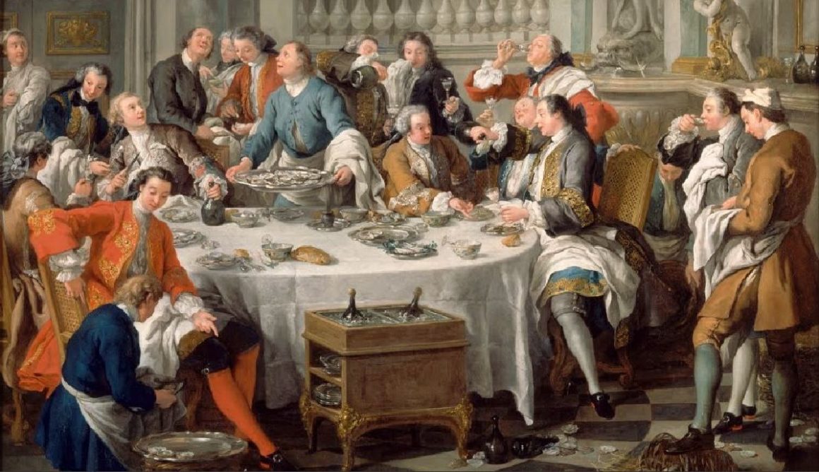 Il quadro, destinato ad ornare la sala da pranzo di un appartamento del Castello di Versailles rappresenta un pranzo di ritorno da una battuta di caccia a cavallo. Sulla tavola un trionfo di ostriche – si narra che ne mangiassero almeno 300 – trasportate rapidamente, in ceste di paglia, dalla costa francese, consumate con pane, aglio, burro, sale e pepe, e come bevanda solo Champagne, che era senz?altro dolce, come allora di moda, e quindi perfetto per contrastare la sensazione salmastra del mollusco; i bicchieri erano di forma conica, ben freddi per mezzo di piccole boule di porcellana riempite di ghiaccio. In primo piano un pregiato mobile in stile Rocaille con funzione di seau ? glace e porta stoviglie, contenente bottiglie di Champagne con tappi di sughero tenuti saldi da diversi giri di spago.